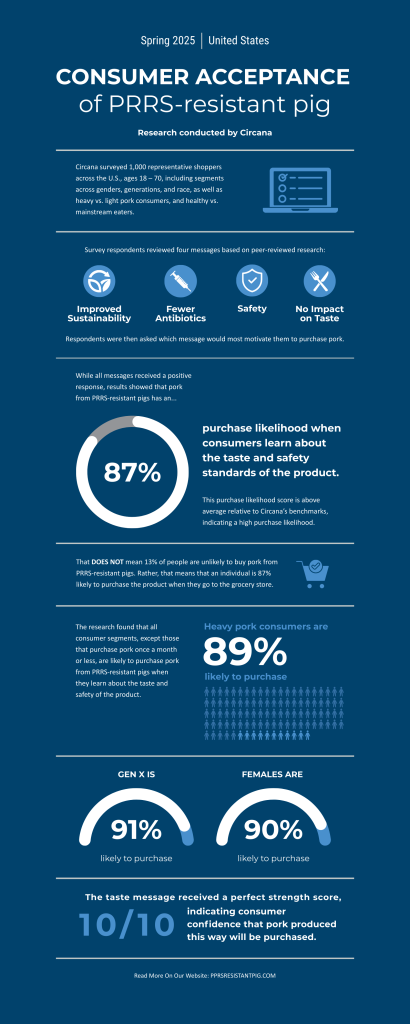 The study surveyed 1,000 representative shoppers across the U.S., ages 18 to 70. The study covered many different consumer segments and had representative segments of each gender, generation and race, as well as heavy vs. light pork consumers and healthy vs. mainstream consumers. Every respondent was the primary or shared shopper for their household, and all had to be current purchasers of pork, or open to buying pork products. Four messages, based on the findings of peer-reviewed research on the benefits of removing PRRS, were shared with the respondents about pork products from PRRS-resistant pigs: Fewer Antibiotics, Improved Sustainability, Safety, and No Impact to Taste.