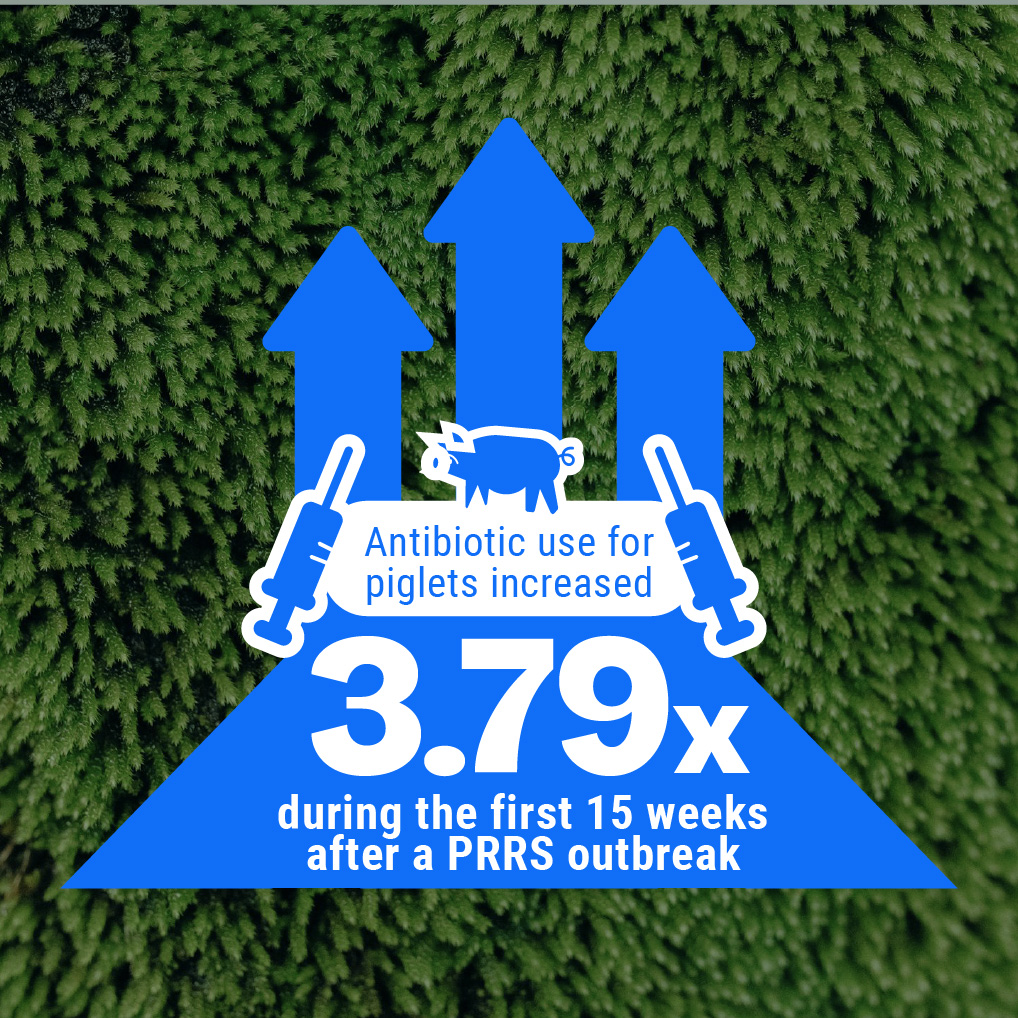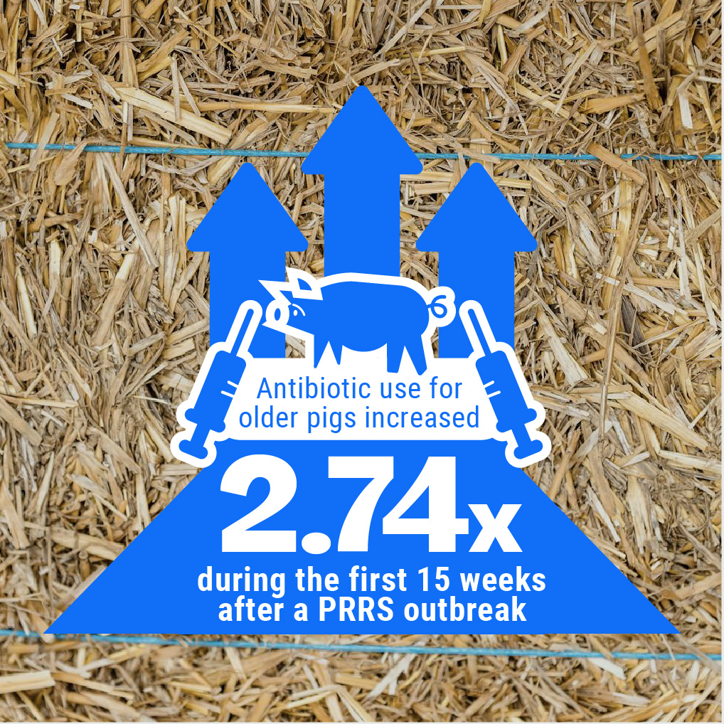 In fact, a recent Iowa State University study found that antibiotic use for piglets increased by more than 3.5x after a PRRS outbreak on a farm. For older pigs, the use of antibiotics increased by more than 2.5x.